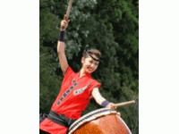 丁寧にまとめ上げた巻き髪で鮮やかな赤い衣装をさっそうと着こなす黛はるかさん。衣装には際立って目立つ「佐倉勇翔太鼓」の..